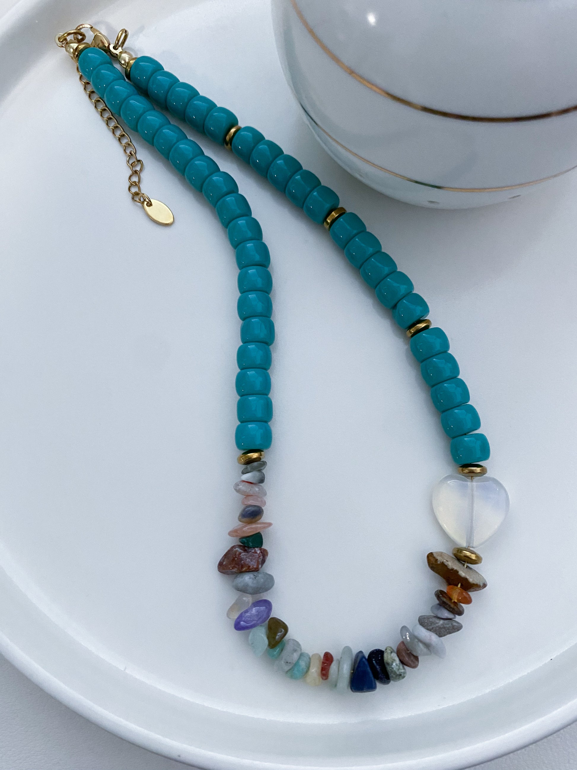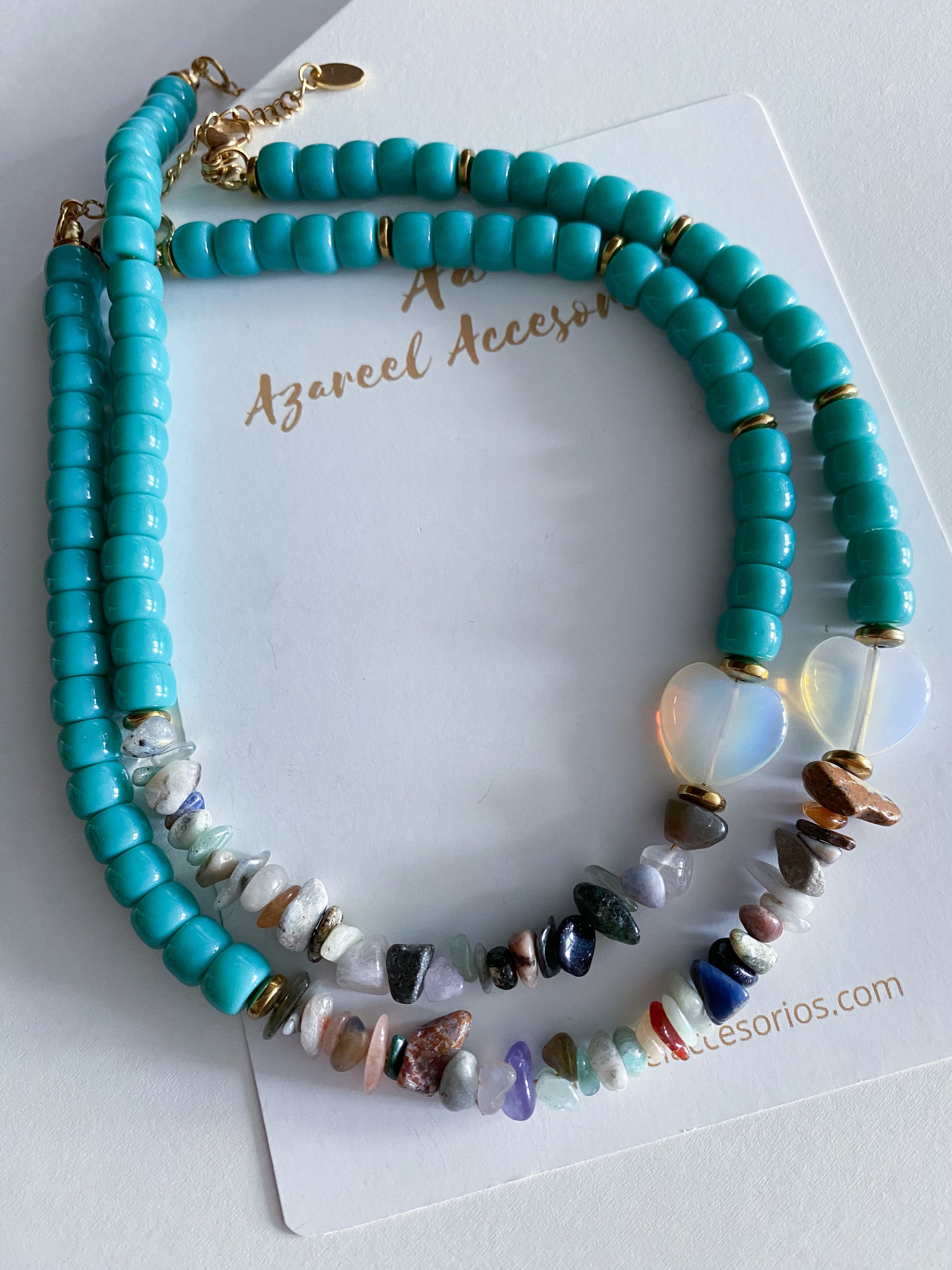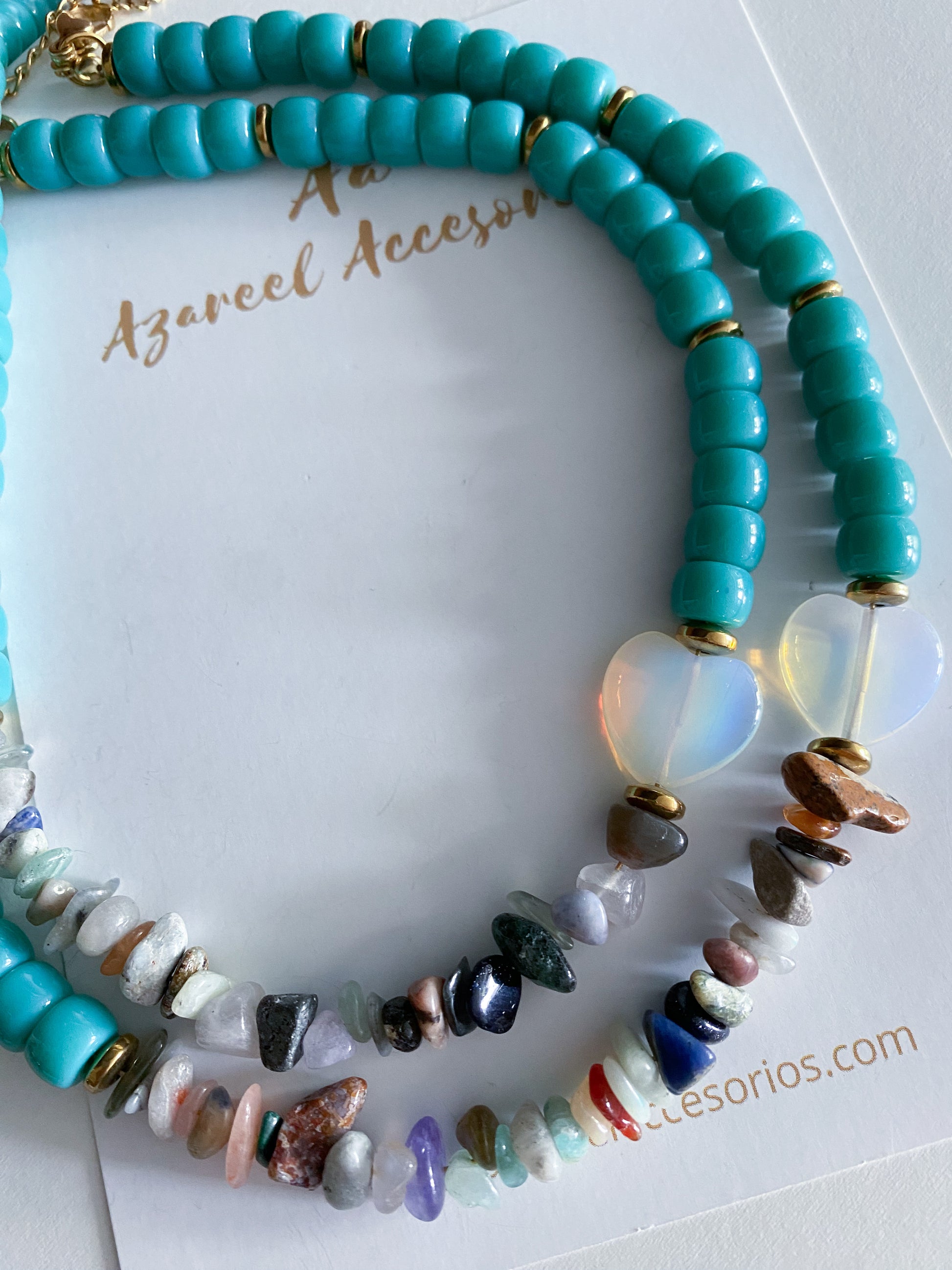 - Materiales: piedras en cristal, jade, ópalo y acero inoxidable.