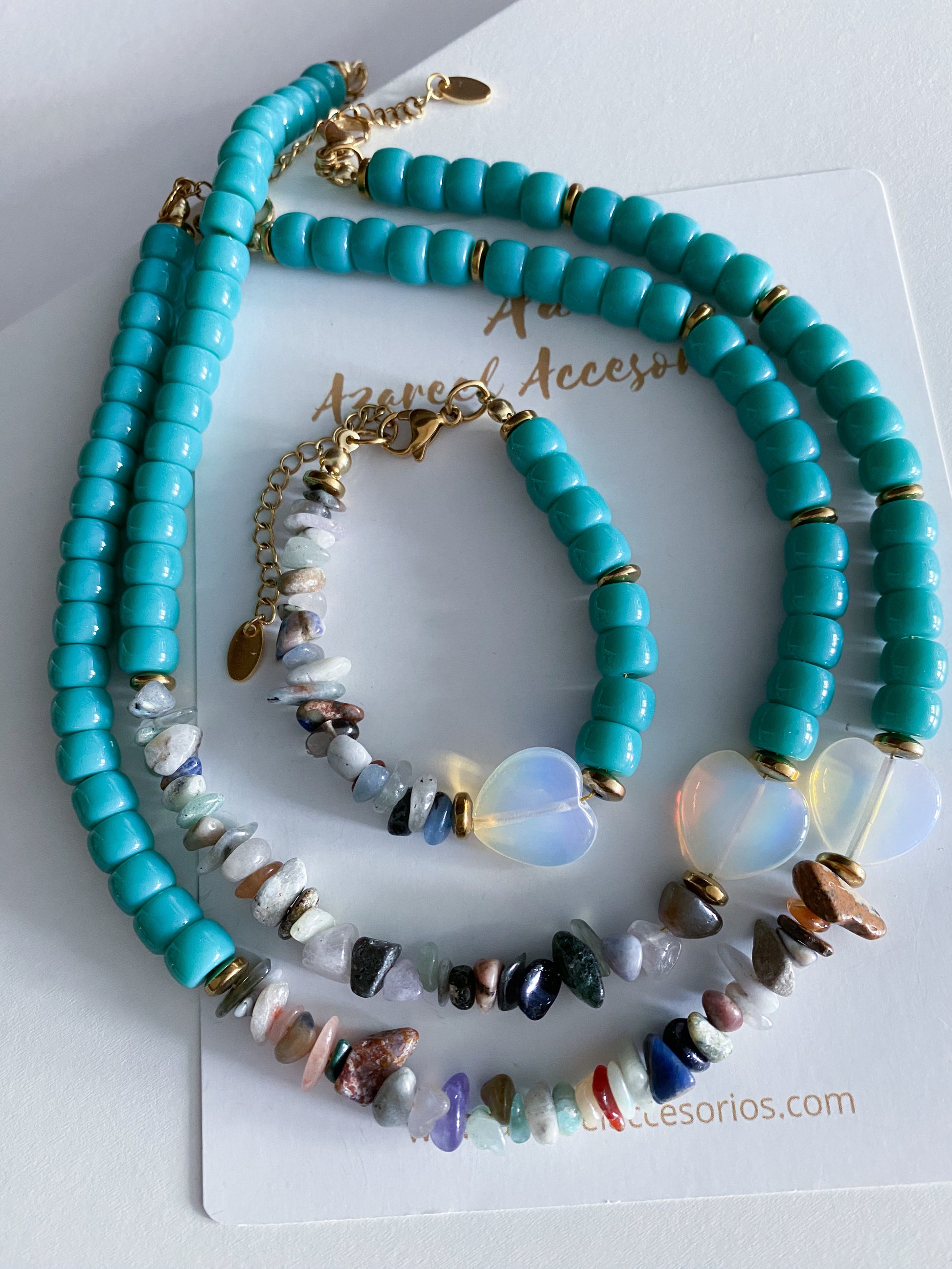 - Materiales: piedras de cristal, jade, ópalo y acero inoxidable.